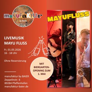 Mit Ihren teils eigen komponierten oder gecoverten Songs, beeinflusst von Manu Chao, Gibsy Kings bis hin zu Rammstein ist Ihnen ein eigener, unverkennbarer und freier, manchmal crazy Mix aus verschiedenen Musikrichtungen gelungen, der gute Laune verbreitet und die Zuhörer zum tanzen bringt. Mit Ihrem Motto: „Immer Gaaaaaas Gebäääää“ verbreiten Sie Rumba, Reggaeton, Ska und Rock in Kneipen, auf Festivals oder Stadtfesten. Wo Mayu/Fluss mit Ihrer Musik unterhält, kann die Party beginnen!