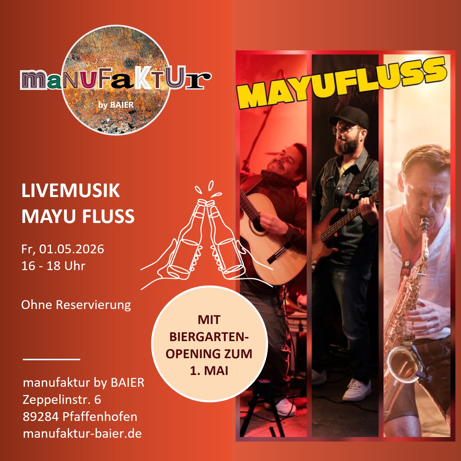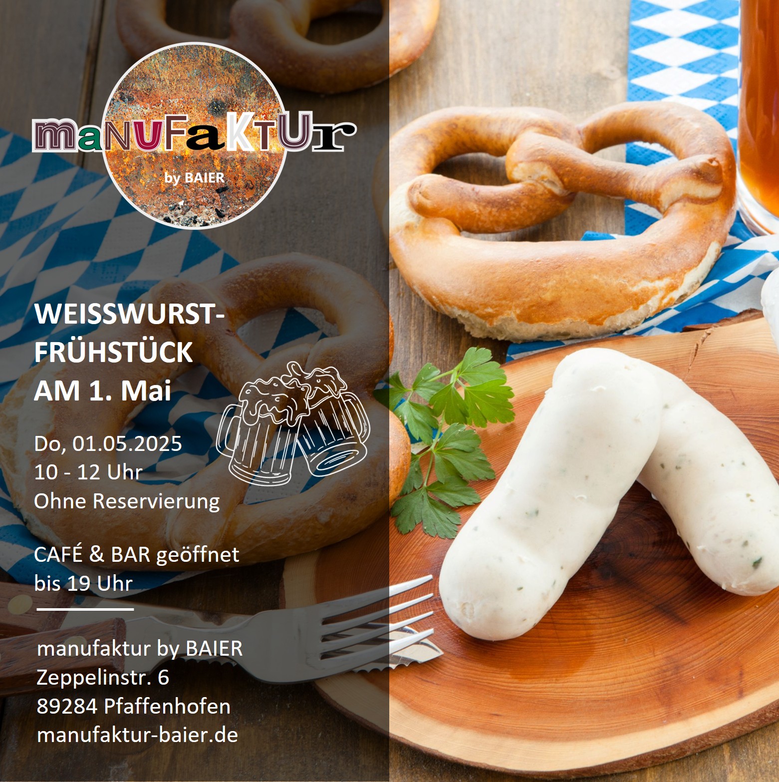 manufaktur by BAIER manufaktur by BAIER, Zeppelinstr. 6, 89284 Pfaffenhofen, Bayern, GermanyHerzlich willkommen zum FRÜHSTÜCKSBUFFET Wählt euren Frühstücksplatz nach Lust und Laune und dann erwartet euch unser FRÜHSTÜCKSBUFFET liebevoll angerichtet im zauberhaften Floristikbereich. Heiße und kalte Getränke l Kaffee* fair gehandelt – wahlweise mit Milch* oder Hafermilch* l Tee-Variationen* von Kräuter Wagener aus Pfaffenhofen l Orangensaft* l gefiltertes ionisiertes Wasser Frische Backwaren l Backwaren – Brot* […]