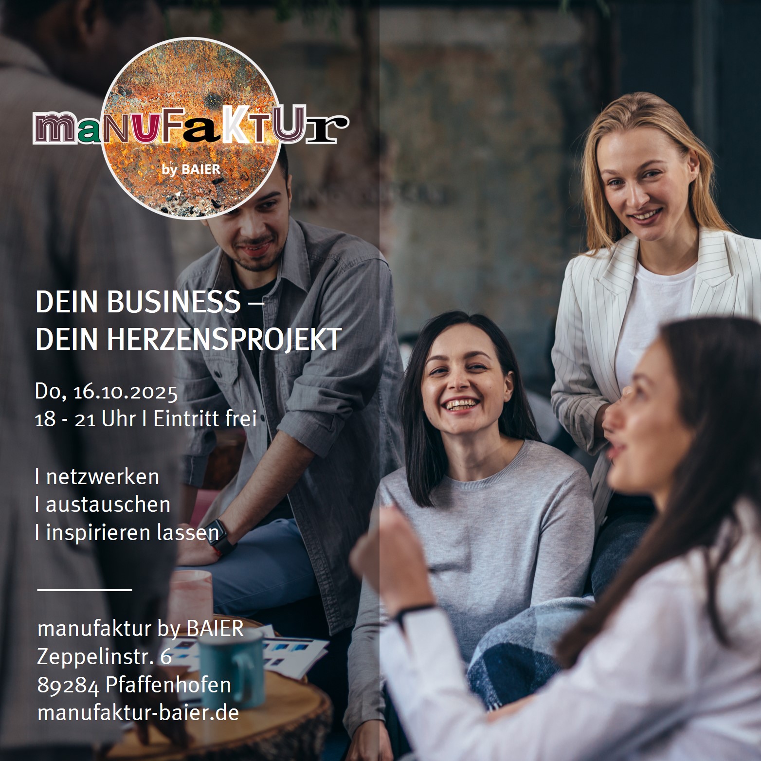 DEIN BUSINESS – DEIN HERZENSPROJEKT 💛 Donnerstag, 16.10. | 18-21 Uhr I Eintritt frei manufaktur by BAIER, Zeppelinstr. 6, 89284 Pfaffenhofen Du möchtest dich inspirieren lassen, neue Projekte entdecken und spannende Menschen mit Herz kennenlernen? Dann komm vorbei zum offenen Networking-Event in der manufaktur by BAIER! Dich erwarten: – rund 30 Herzensprojekte & kleine Businesses … DEIN BUSINESS – DEIN HERZENSPROJEKT I ERLEBNISREICHER TREFF weiterlesen