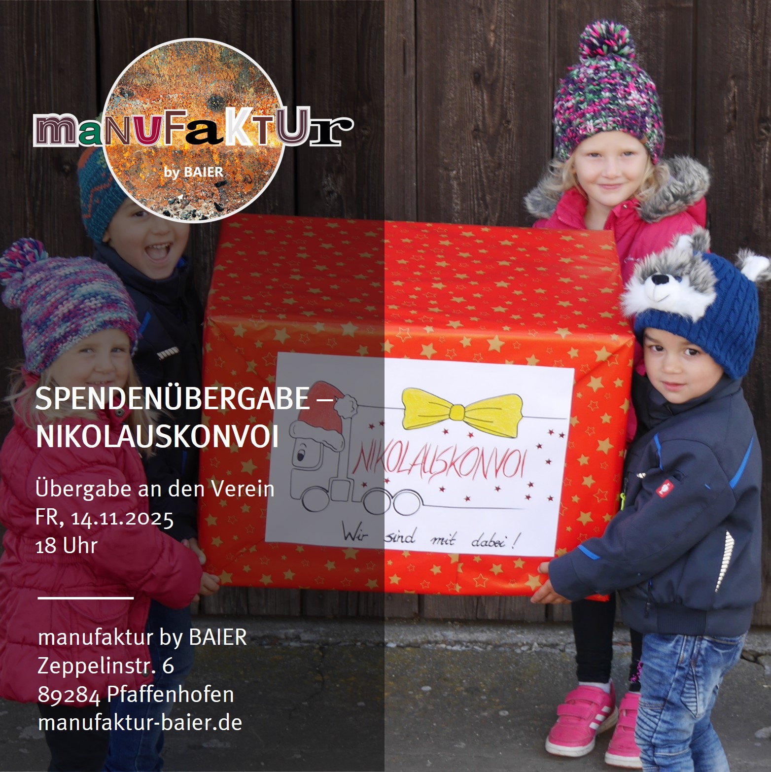 Am Freitag, den 14.11.2025 um 18 Uhr findet im Rahmen unseres manufaktur Zaubers mit Adventsausstellung die feierliche Übergabe der Spenden statt. Für den perfekten musikalischen Rahmen ist ebenfalls gesorgt. Hierzu sind natürlich alle herzlich eingeladen – wir freuen uns über zahlreiche kleine & große Gäste und zählen auf eure Unterstützung! @ Kinder: freut euch auf eine kleine Überraschung, als Dankeschön … SPENDENÜBERGABE NIKOLAUSKONVOI weiterlesen