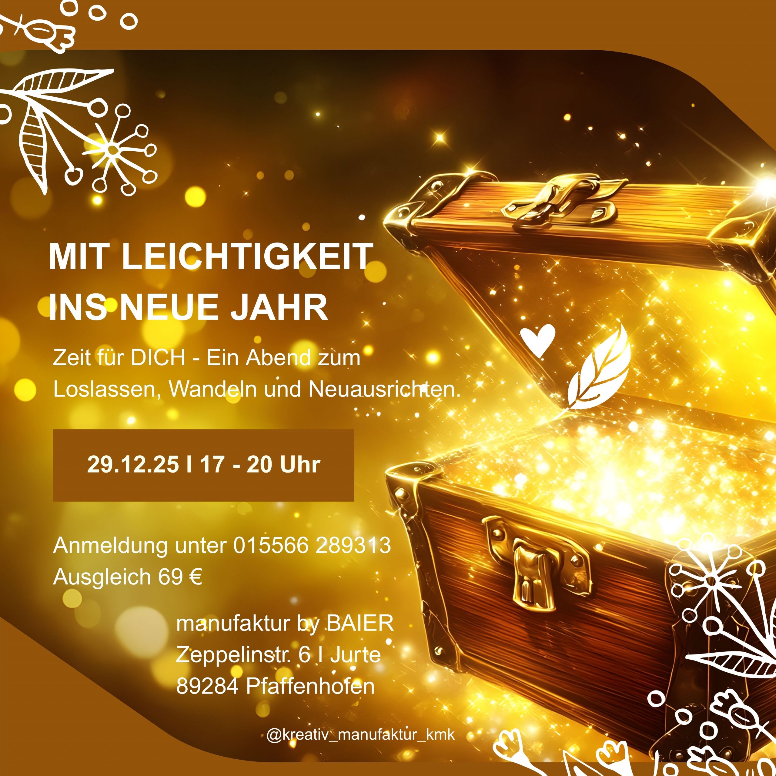 MIT LEICHTIGKEIT INS NEUE JAHR Zeit für DICH – Ein Abend zum Loslassen, Wandeln und Neuausrichten. Zum Jahresende öffnen wir gemeinsam deine ganz persönliche Schatzkiste – und schauen, welche Glaubenssätze / Überzeugungen (beruflich und privat) dich gerade begleiten. Welche davon sind noch stimmig und unterstützend? Und welche dürfen liebevoll verabschiedet werden, um Platz für Neues … WORKSHOP – MIT LEICHTIGKEIT INS NEUE JAHR weiterlesen